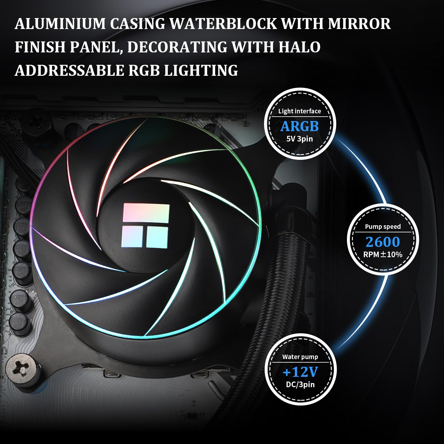 [High Performance Cooling Head] Using 0.1mm pitch high quality copper base, plus the swirl version design with illuminated logo to create a unique pump head, the water cooling head has a life span of up to 40,000 hours and a speed of up to 2600RPM±10%, which ensures long and excellent CPU cooling